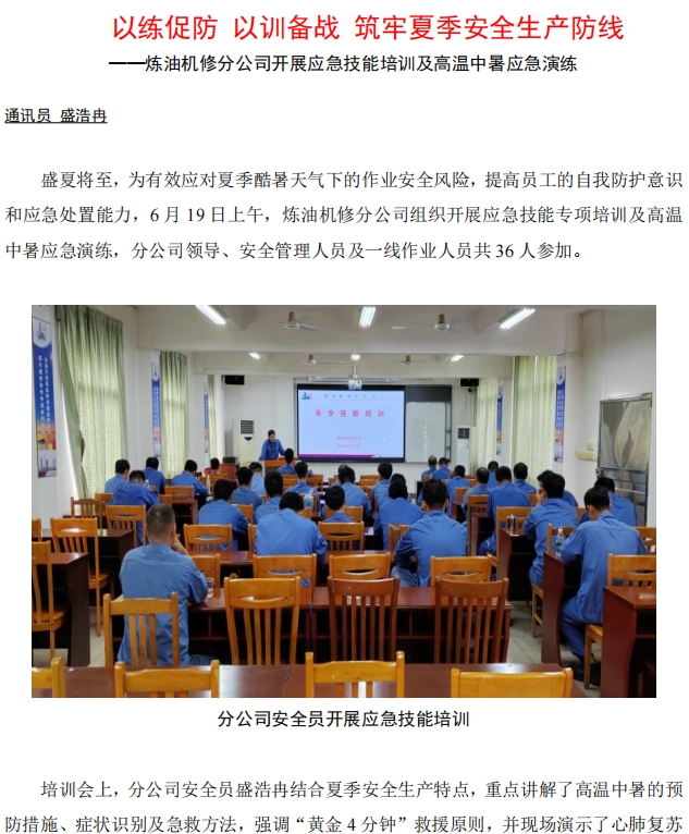 煉油機(jī)修分公司開展應(yīng)急技能培訓(xùn)及高溫中暑應(yīng)急演練