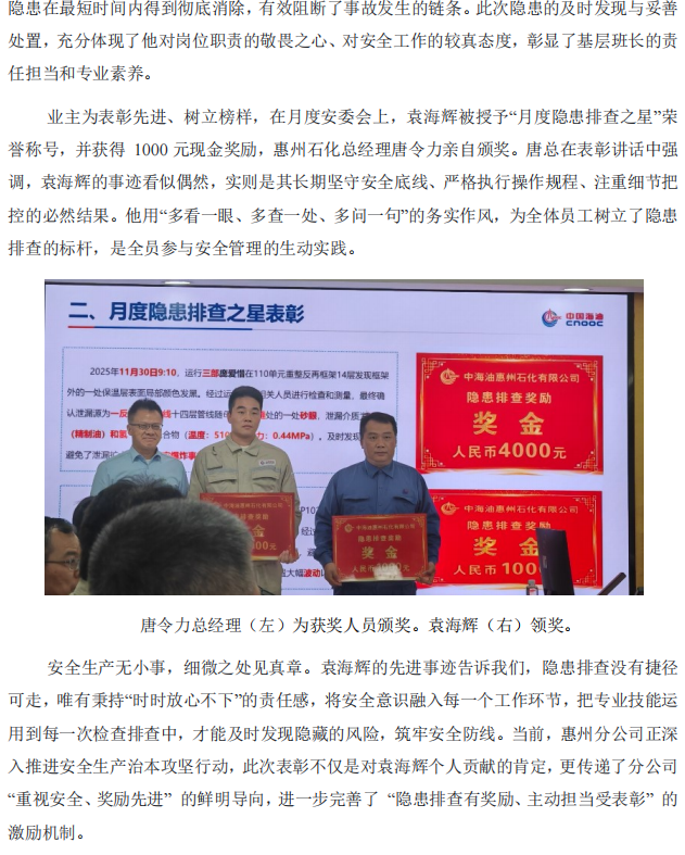 惠州分公司袁海輝隱患排查獲獎(jiǎng)勵(lì)